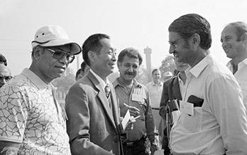 1986年10月6日,袁隆平在杂交水稻试验田里向出席世界首届杂交水稻国际学术讨论会的外国专家学者介绍情况。(图片来源:国际稻都网)