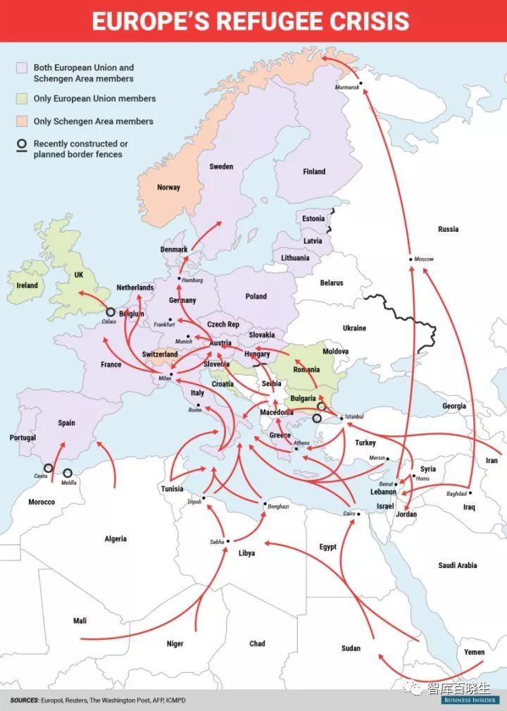 2015年,数百万来自中东、北非和西亚的难民涌入欧洲,使欧洲面临第二次世界大战后“最严重的难民危机”。