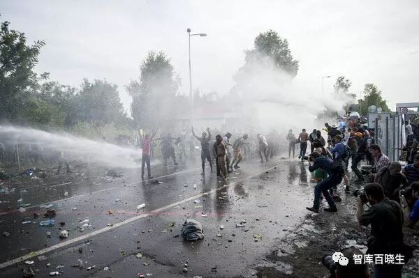 用水枪驱散难民