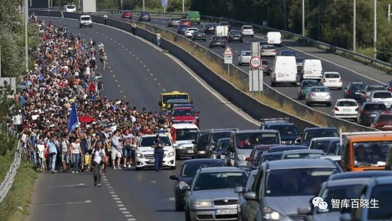 说来也巧,那天胖爷刚刚在布达佩斯开完会,准备开车去维也纳,在奥地利和匈牙利额边界上堵车堵了整整4个小时,路边一群一群的难民沿着高速路缓慢的移动。