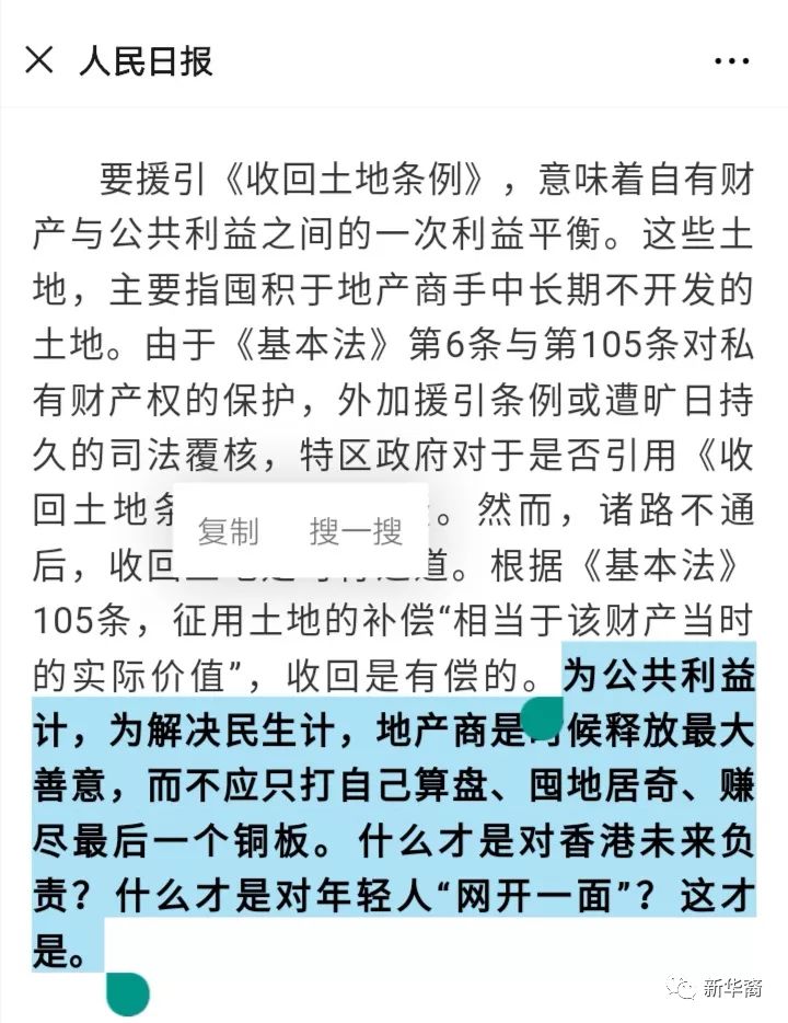 新华社刊文《从解决居住难题入手破解香港社会深层次矛盾》,直截了当地表示“修例风波发展至今,折射出的香港社会深层次矛盾亟待解决,其中最突出、最迫切、最让人诟病的是住房问题,已到了痛定思痛、必须解决的时候了”,“居者有其屋,方能形成社会的稳定力量”,香港基层市民和青年一代“日日辛苦打拼,却难以分享到香港经济发展的红利,实在不合情理,也为社会的动荡埋下了伏笔”。