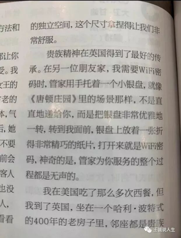 反观田朴珺女士的新书《三代人才能培养一个贵族》里面讲贵族是什么呢?她说:“我需要WiFi密码时,管家用手托着一个小银盘,就像《唐顿庄园》里的场景那样,不是直接递给你,而是把银盘非常优雅地转到我面前,银盘上放着一张折叠得非常精巧的纸片,打开来就是WiFi密码,神奇的是,管家为你服务的过程都是无声的。”这就是她眼里的贵族生活和贵族精神。