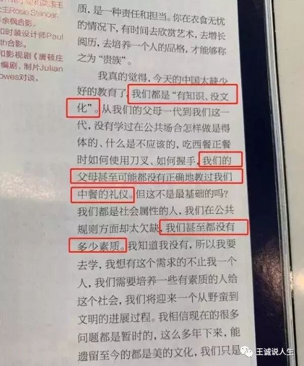 田朴珺女士说“我真的觉得,今天的中国太缺少好的教育了。从我们的父母一代到我们这一代,没有学过在公共场合怎样做是得体的、什么是不应该的。太多中国人有知识,没文化。”我真心觉得田女士确实是有知识没文化的人,大学都没有毕业,而且还是被开除的。在中戏念也只是高职,根本不是她宣称的本科。我真心觉得田女士应该花99万回中戏补课回炉,从不合格产品变成了合格产品,再出来混社会。