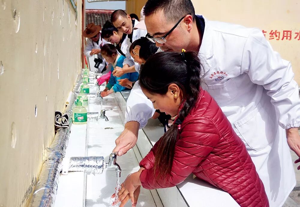 ▲ 2017年8月8日,四川省石渠县德荣玛乡中心小学,当地疾控中心工作人员正在教学生正确洗手方法 董小红摄