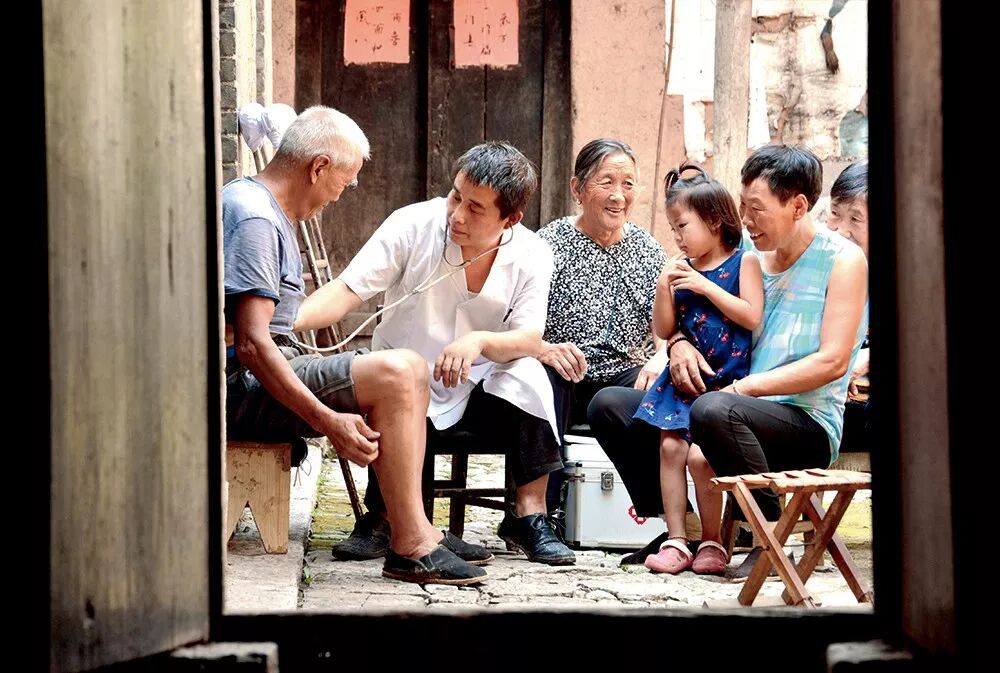 ▲ 河北省邯郸市涉县神头乡前宽嶂村,乡村医生李双荣(左二)上门为老人做检查(2018年8月15日摄)王晓摄