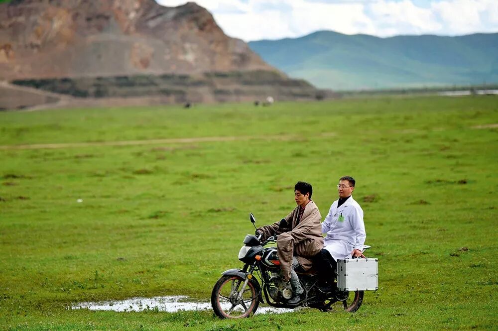 ▲ 6月23日,甘肃省第二人民医院援藏医疗队队员在甘南藏族自治州玛曲县搭乘摩托车出诊 陈斌摄