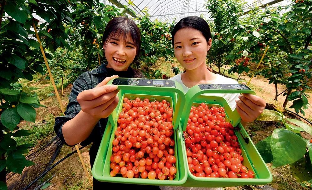 ▲ 2018 年4 月19 日,江西省余江县杨溪乡灵溪小镇生态乐园内,游客手提智慧果篮体验采摘乐趣 宋振平摄
