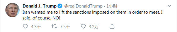 情况是这样的,据环球网转引俄罗斯卫星通信社的消息,伊朗总统鲁哈尼9月27日表示,美国提出放弃对伊朗的所有制裁,以换取谈判。然而,很快特朗普就发推否定了这一说法。特朗普说,伊朗要我解除对他们的制裁,以换取见面。我当然说不了!”