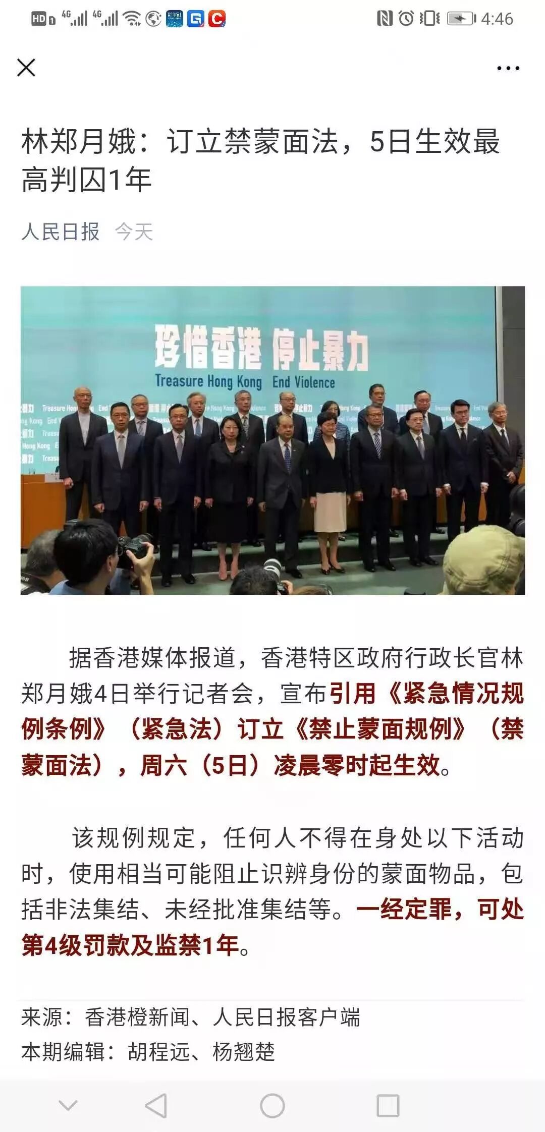 而今天(10月4日)发生的大事,则带有转折的意味。下面是人民日报公众号的截屏,大家可以看一下:这项法规的制定和出台,对于减少暴力事件,维护香港稳定将起到积极作用。事实上,近年来很多国家和地区,都出台了类似的法律法规,比如美国、意大利、德国、法国、加拿大等。