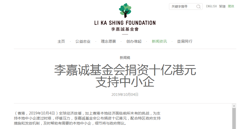 此外,今天香港还有一个重要新闻——李嘉诚通过“李嘉诚基金会”官网宣布——捐出10亿港币,帮助有需要的本地中小企业。全球经济放缓,加上香港本地经济面临前所未有的挑战,为支持本地中小企渡过时艰,纾缓压力,李嘉诚基金会公布捐资十亿港元,配合特区政府支持措施和发放机制,及时帮助有需要的本地中小企,细节将与政府商议。