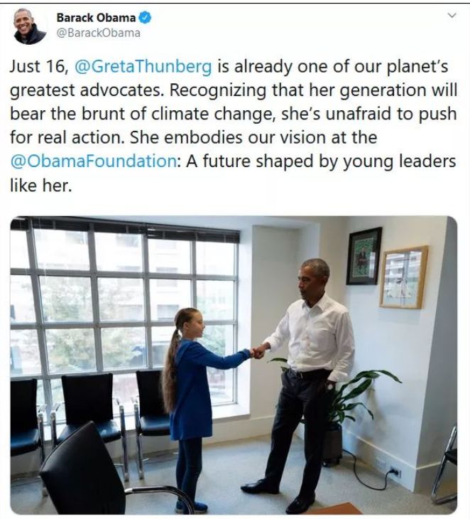 比如奥巴马在上个月16号见完她后,不但发推特表示了自己对Greta的赞赏。