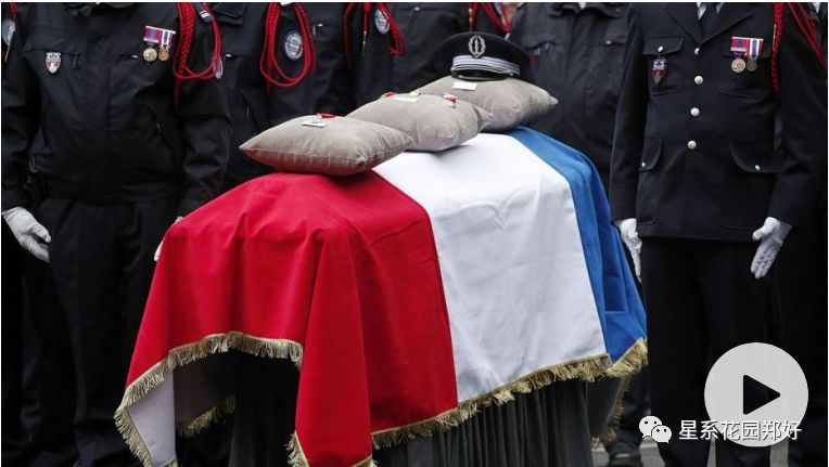 总统举行的仪式还向四名遇难者颁发了法兰西最高荣誉勋章Légion d’Honneur merits,他们的棺材上覆盖着法兰西三色旗。