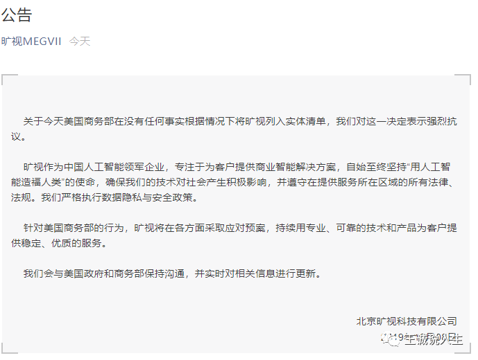 旷视科技在公告中除了对特朗普政府强烈抗议以外,还顺便给自己做起了广告:“旷视作为中国人工智能领军企业,专注于为客户提供商业智能解决方案,自始至终坚持‘用人工智能造福人类’的使命”!这广告价值千金啊!