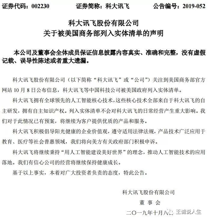 与旷视科技一样掌握全球独步核心技术的科大讯飞,广告也是做得飞起,公司公告说:“科大讯飞拥有全球领先的人工智能核心技术,这些核心技术全部来自于科大讯飞的自主研发,拥有自主知识产权。列入实体清单不会对科大讯飞的日常经营产生重大影响。我们对此情况已有预案,将持续为客户提供优质的产品和服务!”这广告也是做得没谁了,反正吹牛有特朗普这个猪来给认证,不吹白不吹啊,哈哈哈!