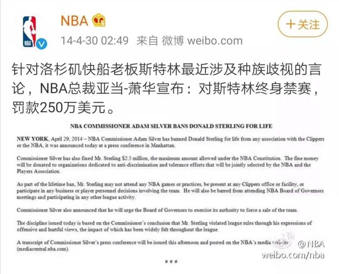 要知道快船老板斯特林只不过是在私人电话里表达自己对黑人的看法被录了音,就被官方巨额罚款终身禁止参与篮球事务,连球队都被逼贱卖了。