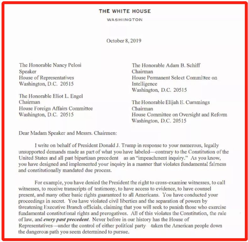 情况是这样的——10月8日,白宫给美国众议院议长佩洛西发了一封长达8页的信,信中表明特朗普及白宫对于“弹劾”一事的态度。