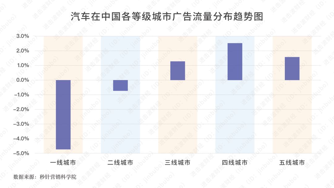 比如汽车行业的共识是,下沉市场成为主要的拉动力,这在秒针的数据里非常明显,汽车品牌在一二线的投放量都是负增长的。