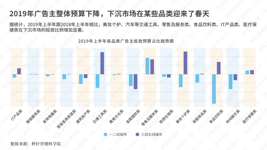 2019年,是广告主预算整体下降的一年,尤其是在大宗硬广投放上。在整体的下降中,上半年,三四五线城市在15个品类中, 有6个是显著上升的。
