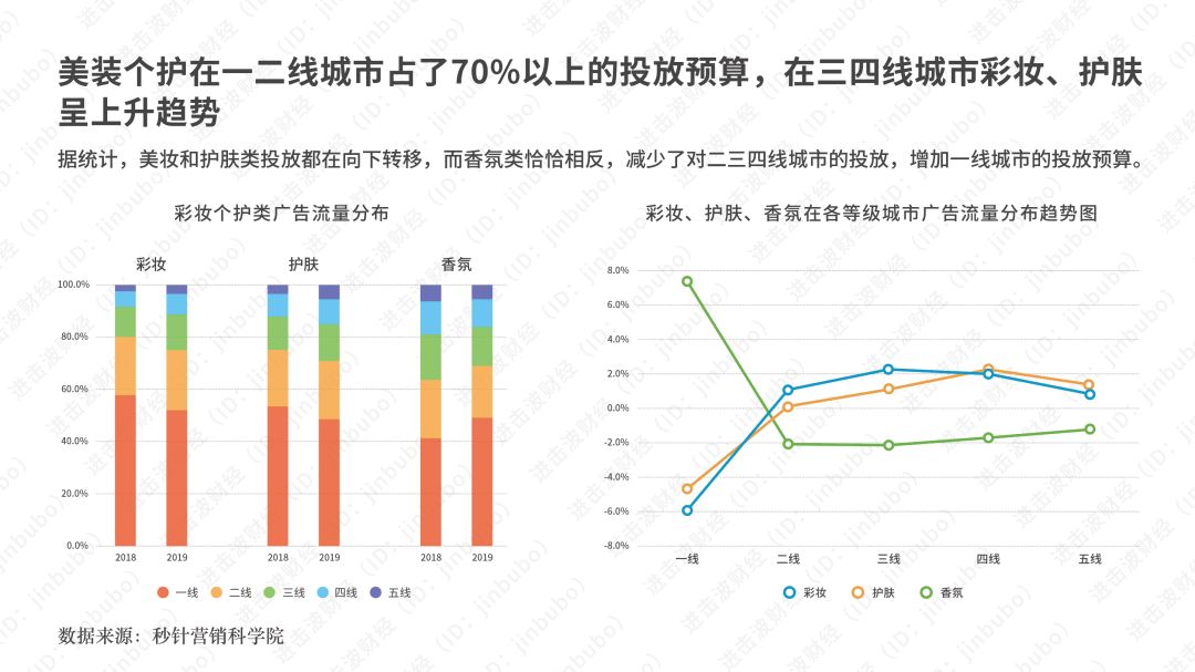 根据秒针营销科学院数据,下沉市场的投放体现出了集体性的上升,但是一二线依然占了70%的投放预算,唯独香氛类产品减少了对下沉市场的投放。