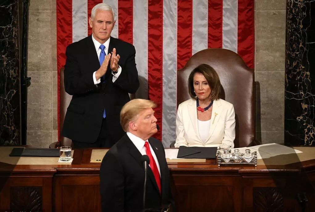 2019年2月,特朗普在众议院发表任内第二次国情咨文,右侧为佩洛西(来源:VCG)