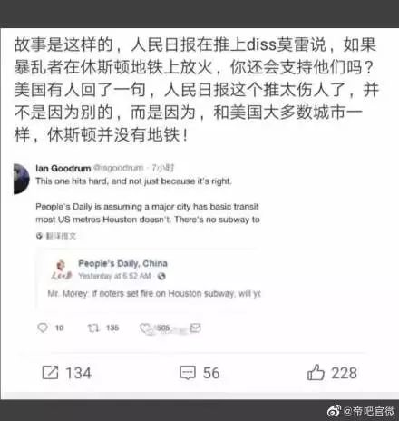 就在前几天,《人民日报》质问莫雷:如果暴徒在休斯顿地铁纵火,您也支持吗?结果尴尬了,美国网友纷纷吐槽,说《人民日报》的推文太伤人了,因为休斯顿太破旧,与美国大多数城市一样,根本没有地铁。