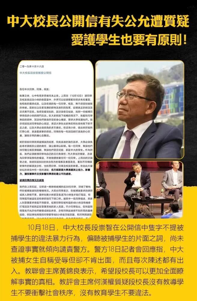 看到没有?作为一个大学的校长,面对自己的学生在大街上成为暴徒,大规模破坏香港社会秩序,他不但没有站到正义的一边,反而是根据那些暴徒的一面之词,在没有调查的情况下,把这些一面之词一股脑全部栽给香港警察,尔后要求警方“查明细节清晰交代”,并称“将为被捕学生提供协助”。