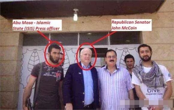 上图是麦凯恩2011年到利比亚内战前线“慰问”基地组织头目的合影,其中最左边的头目,后来成为IS的新闻发言人,这张照片流出后不久被击毙。