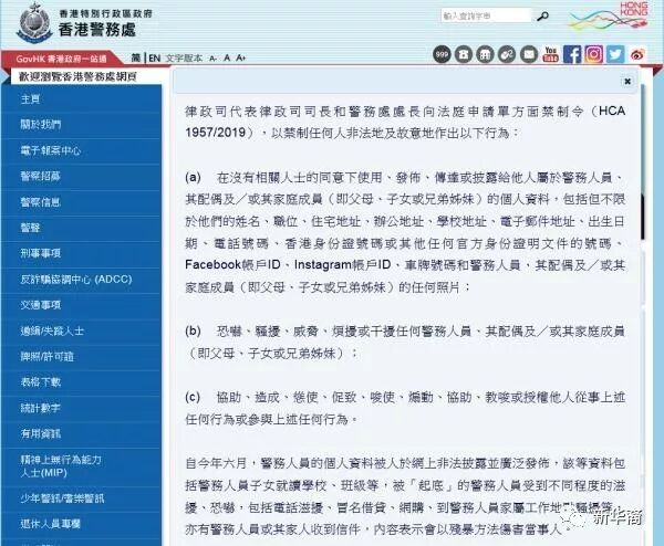 据悉,10月25日,香港律政司长及警务处长联袂入禀高等法院,申请上述临时禁制令。原告分别为律政司长及警务处长(代表本人及《警队条例》下的其他警员及辅警),被告为“非法披露或使用警员及辅警个人资料的人士”。