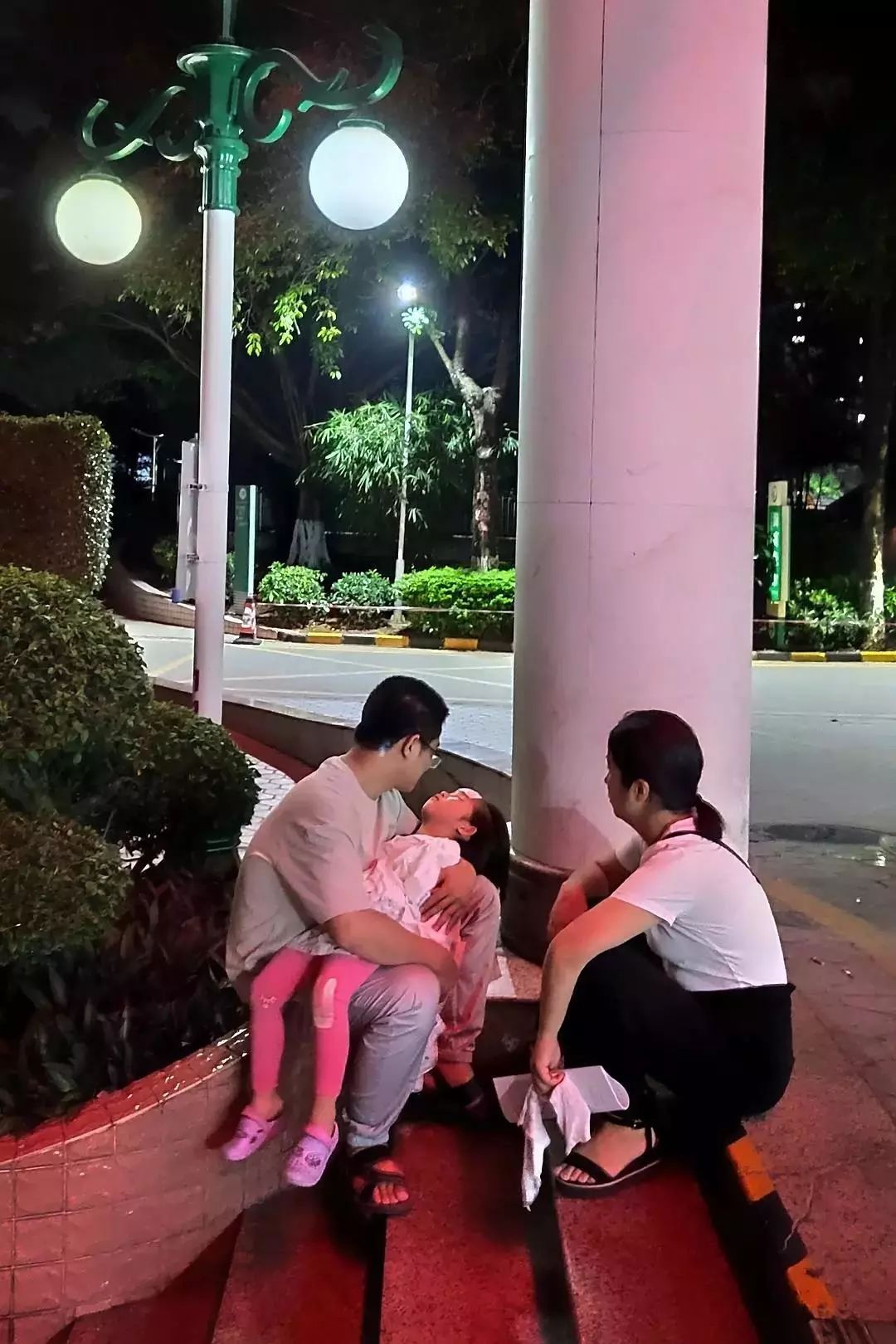 在医院门口,丈夫抱着女儿,女儿额头贴着退热贴,睡得正香,妻子看看丈夫再看看女儿,眼里都是心疼。