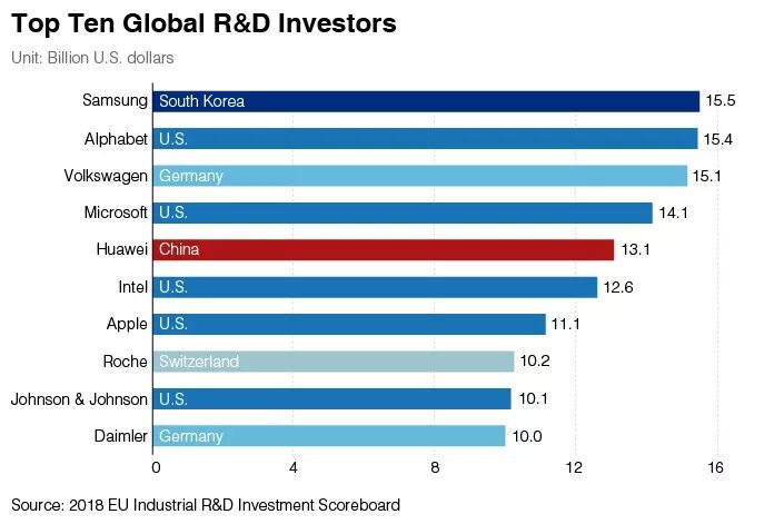 千万不要认为三星是一个过气的巨头,即使以华为引以为傲的研发和专利来看,三星仍然优势明显,三星位列2018年全球研发投入的排名第一,在持续的高研发投入背景下,三星这几年来每年的新增专利数量一直仅次于IBM排在全球第二。