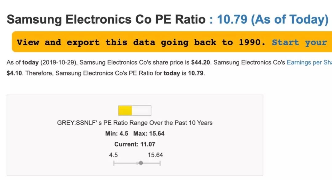 三星目前的动态市盈率为10.79倍,曾在2018年低至4.5倍