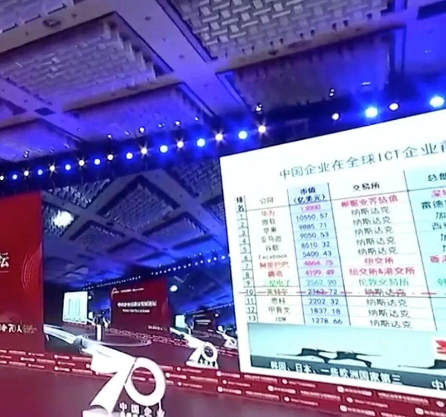 10月26日,在中国企业高质量发展论坛上,中国工程院院士倪光南介绍全球信息和通信领域企业市值排名,前10家中美国有6家,中国有华为、阿里和腾讯三家上榜,最后一家是三星。