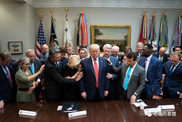 这么一大群人到底在玩什么鬼把戏?原因说出来令人喷饭,他们在集体发功!这些人都是福音派的牧师和宗教领袖,他们要把自己多年修炼的功力传给川皇,祝他渡劫成功,早日飞升。当然,这是我按照中国文化背景的解释。