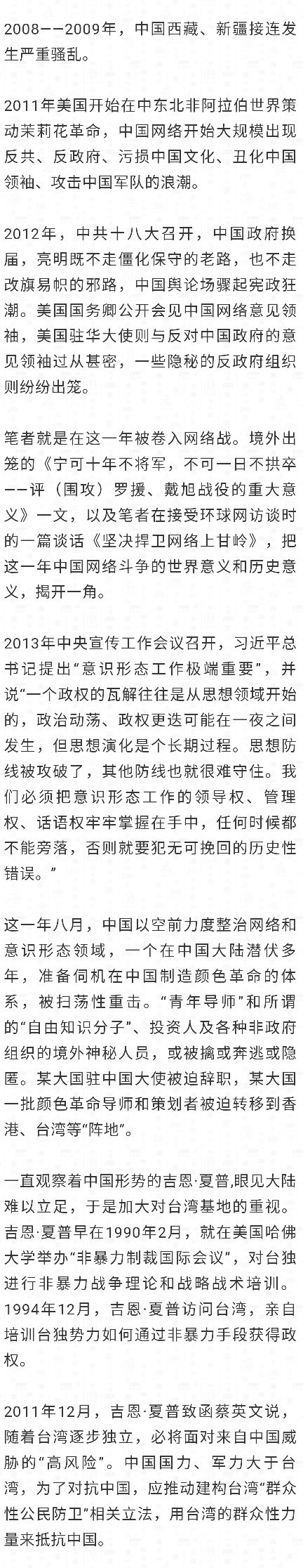 但是,新时代也会遭遇新威胁。这就是我连续不停地撰写新战争的原因。作为新时代的战士,也曾亲身参与网络意识形态斗争和反颜色革命实践……在我供职的军事教育单位,我将这些最新鲜的“战争心得”初步提炼,于2015年开设“第七代——网络化多形态混合战争”课程。我希望中国军队的指挥员尤其是年青军官们,能够成为新战争命题的破解者、驾驭者,成为新胜利的获得者。