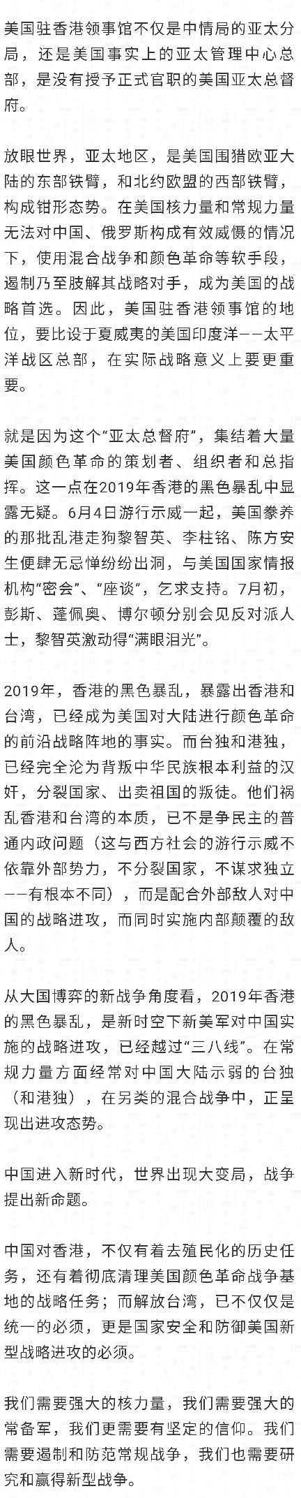 我特别寄希望于中国社会的年青人。在2012年网络意识形态斗争中涌现出的网络义勇军和2016年反台独的全球舆论战中涌现出的“帝吧”军团,以及2019年反香港黑色暴乱中涌现的“饭圈”女孩。在网络中成长起来的新一代中国少年、青年,他们她们爱国爱家,意识新潮而意志坚定,激情勃发而团结一致。强大的国家必以强大的青年为主力为支撑。