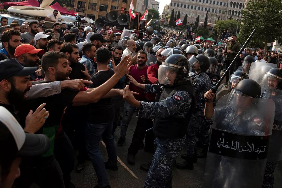 (2019年10月25日,黎巴嫩贝鲁特,当地示威抗议持续,真主党支持者与防暴警察激烈对峙。)