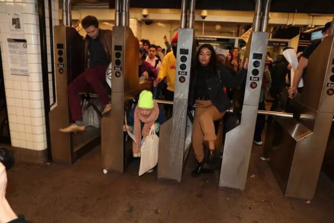 成群结队的人跳过地铁闸机,公开逃票,并在路障背后与警察对峙。