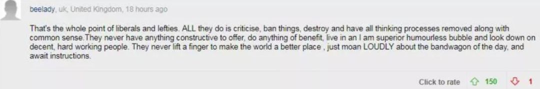 “这就是自由主义者的特点。他们所做的只是批评、禁止、破坏,破坏所有思维过程以及常识,他们从没有提供建设性的东西,做任何有益的事情,他们生活在一个没有幽默感的超级泡沫里,并看不起体面的,在努力工作的人。他们从不为使世界变得更美好而动动手指,只是大声地抱怨。”