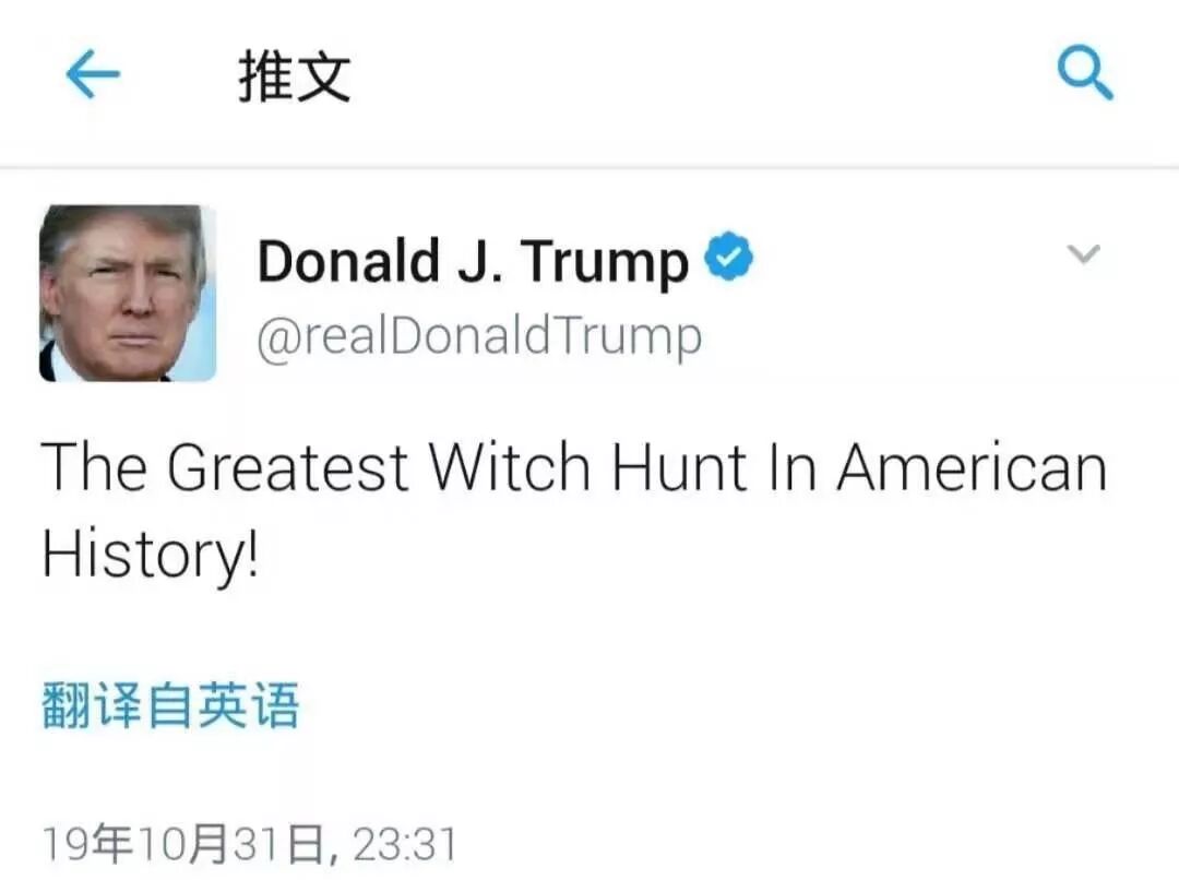 就在弹劾调查程序议案获得通过之后,特朗普立即发推特称“这是美国史上最大的‘猎巫行动’ (Witch Hunt) ”。