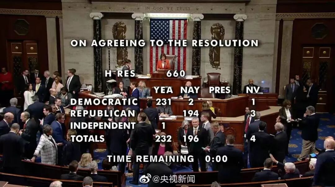 但众议院所有的共和党议员都投了反对票,而民主党议员几乎都投了赞成票 (只有2票反水支,反对调查持特朗普的) 。