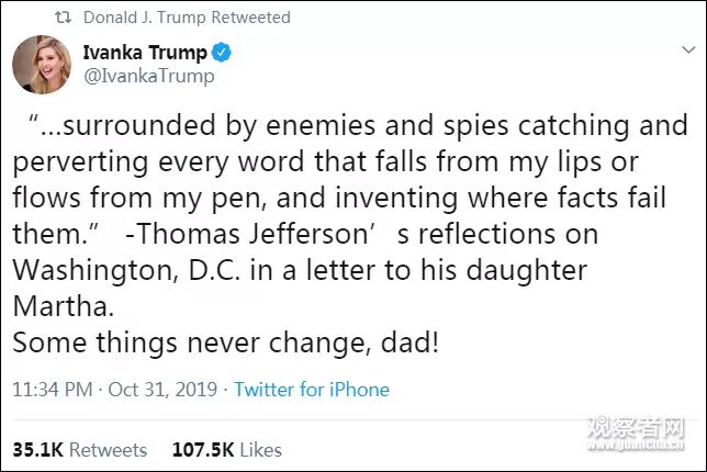 而特朗普的大女儿伊万卡则援引杰斐逊 (美国国父之一) 写给其女儿玛莎的一封信:“我被敌人和间谍包围,我每说一句话,每写一个字,他们都会曲解。如果事实与他们相违背,他们就会捏造事实。”