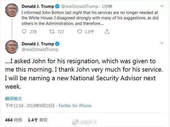 9月10日,特朗普突然在推特上说,自己非常不赞同博尔顿的很多建议,并宣布自己炒掉了博尔顿。