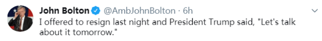 一个小时后,博尔顿也发了一条推特“澄清”,说自己是主动辞职的。
