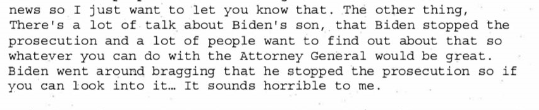 “许多人都在议论拜登的儿子,说拜登阻止了对其儿子的起诉。很多人都想搞清楚是怎么回事,所以如果你能和司法部长做些什么那就太好了。拜登到处吹嘘说他阻止了起诉,你能否调查一下,这对我来说听起来太可怕了。”