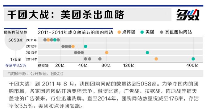 千团大战的存活率只有3.5%。后面的事情大家也知道了,胜出的美团和点评团也在资本撮合下最终合并。