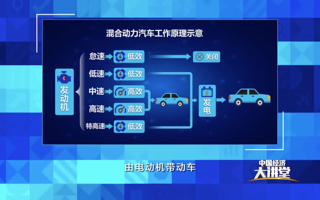 第一种,就是我们经常说的油电混合电动汽车。这种电动汽车在1900年就有了,但是现代混合动力汽车实际上是1997年丰田普锐斯推向市场的时候才到来的。燃油车是以内燃机为动力的,但是燃油车里头的内燃机动力的效率不能经常在一个最优效率的工况运行,因为我们的车速度时高时低,负载时大时小,而我们的内燃机又是跟车连在一起,所以就会受影响,比如说怠速、低速等等,或者非常高的速度都是不好的。混合动力就是用电机、电池的方式优化内燃机的工作点,如果内燃机在高效区,我们就让它直接驱动汽车;如果在低效区,我们就让它断开机械的驱动,带动发电机发电,然后由电驱动电动机,由电动机带动车,这样又把效率提高了,这就是混合动力。