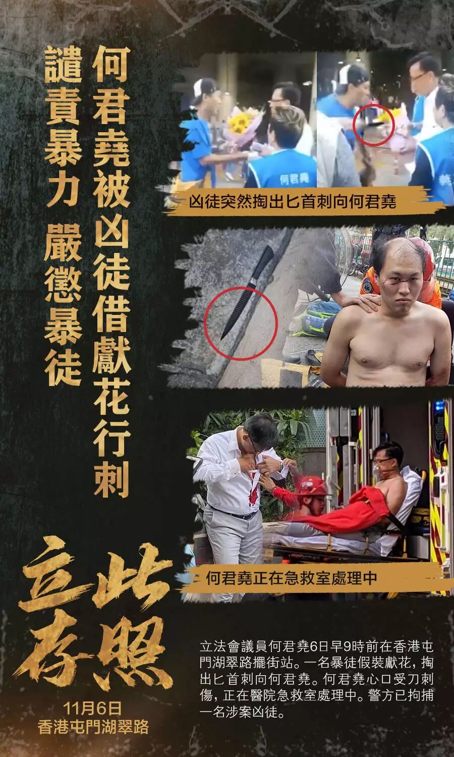 “欲使人灭亡,先使人疯狂。”香港暴徒在穷途末路上越走越远。11月6日,香港立法会议员何君尧“摆街站”时遭到袭击,凶手假借献花之机突然拔刀刺向何的胸膛,造成何君尧在内的三人受伤送医。事发后,警方拘捕涉案男子,特区政府对袭击行为表示强烈谴责。每一个关心爱护香港的市民、每一个心存正义良知的人士都极度愤慨、绝不容忍!