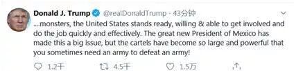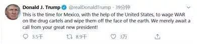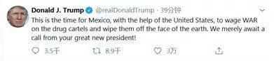 “对墨西哥来说,现在已经到了在美国帮助下向贩毒集团开战,并将他们从地球上铲除掉的时候了。我们只是在等待你们伟大的新总统的一个电话!”