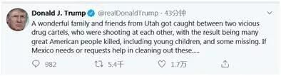 “来自犹他州的一个很棒的家庭和朋友被两个凶残的贩毒集团抓住了,他们两方互相开枪,结果导致许多伟大的美国人被杀害,包括年轻的孩子,还有一些人失踪了。”