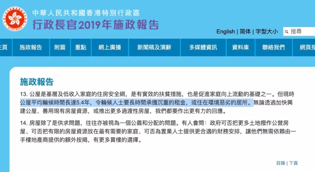 在行政长官2019年施政报告中,提及公屋平均等待时间为5.4年
